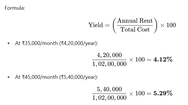 So actual gross rental yield = ~4.1% – 5.3% (much stronger than the Hyderabad average of ~3–3.5%).